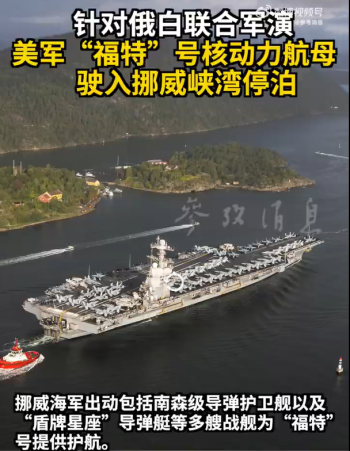 美军福特号航母驶入挪威峡湾,对俄白军演形成强烈回应!