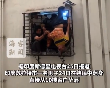 印度男子熟睡中翻身坠楼被卡8楼 倒悬一小时后获救