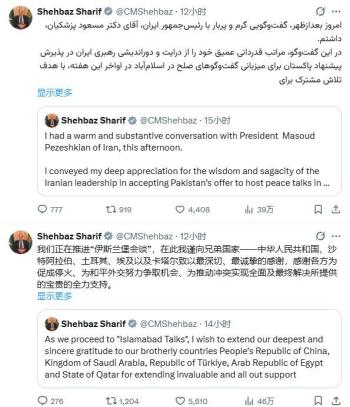 巴基斯坦总理发文感谢中国 赞赏多方支持促成停火