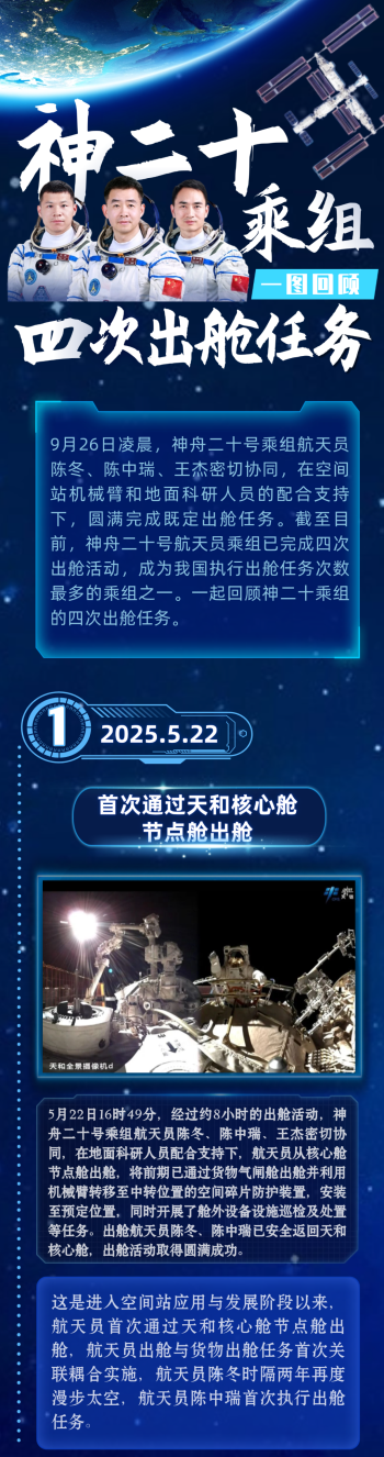 一图回顾神二十乘组四次出舱任务 精彩瞬间定格太空