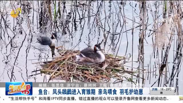 鱼台:凤头鸊鷉进入育雏期 亲鸟喂食 羽毛护幼崽