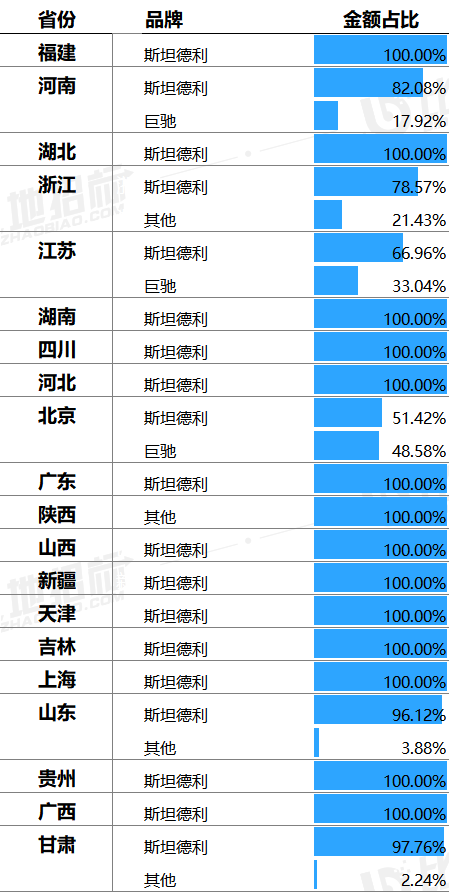 不同地区对品牌的偏好有所不同,大部分地区偏好斯坦德利。