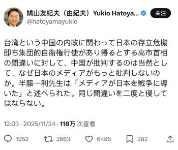 鸠山由纪夫:中国批评高市理所当然 错误言论引多方批评